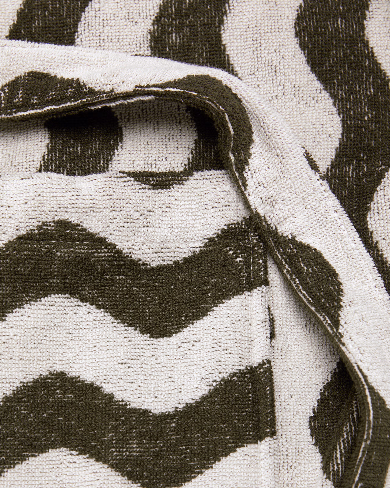 De Forest Waver Long-badjas is geweven van zwaar katoenen badstof met een jacquardpatroon en versierd met een elegant golvend motief. Het lange silhouet wordt geaccentueerd door een reverskraag, opgestikte zakken en een afneembare ceintuur. Unisex.