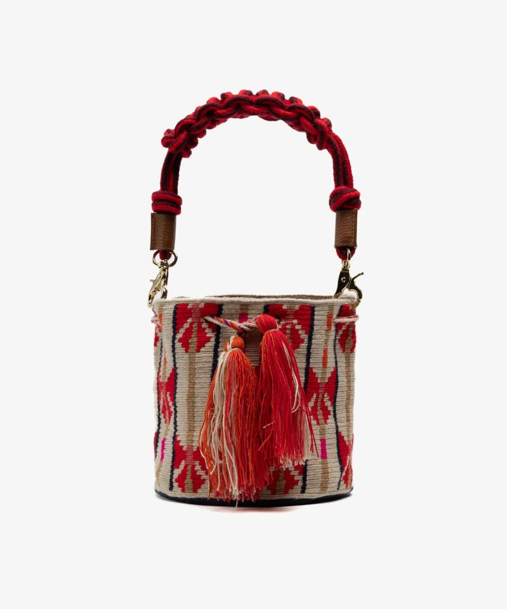 GUANABANA’S ontwerpteam brengt deze exclusieve tas voor dagelijks gebruik in Madrid als een kleinere versie van onze traditionele handgehaakte Colombiaanse Wayuu mochila. De modieuze patronen, kleuren, geometrische vormen en het met boomstammen gevlochten handvat maken van deze tas een functioneel product dat je bij je avonturen kunt dragen. Bekijk de bodem en verwen jezelf met verschillende decoraties in elke tas. De tas sluit met kleurrijke pompons en ons opvallende bronzen label met het leidmotief van GUANABANA: BE POSITIVE.