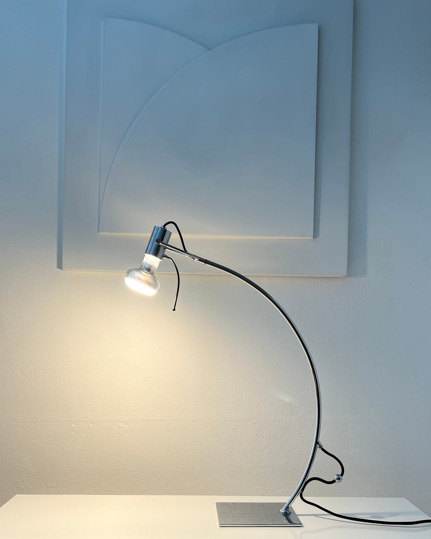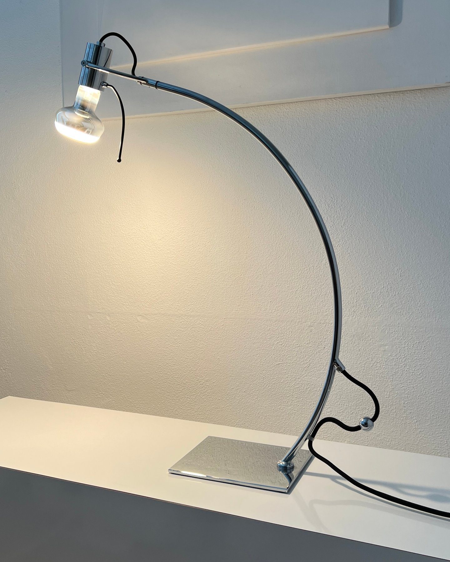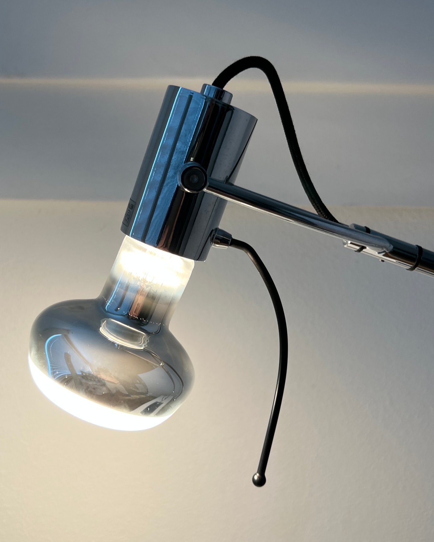 De lamp is volledig verstelbaar en kan in verschillende richtingen worden gepositioneerd. De verfijnde balans tussen techniek en vorm maakt dit object zowel functioneel als architecturaal.