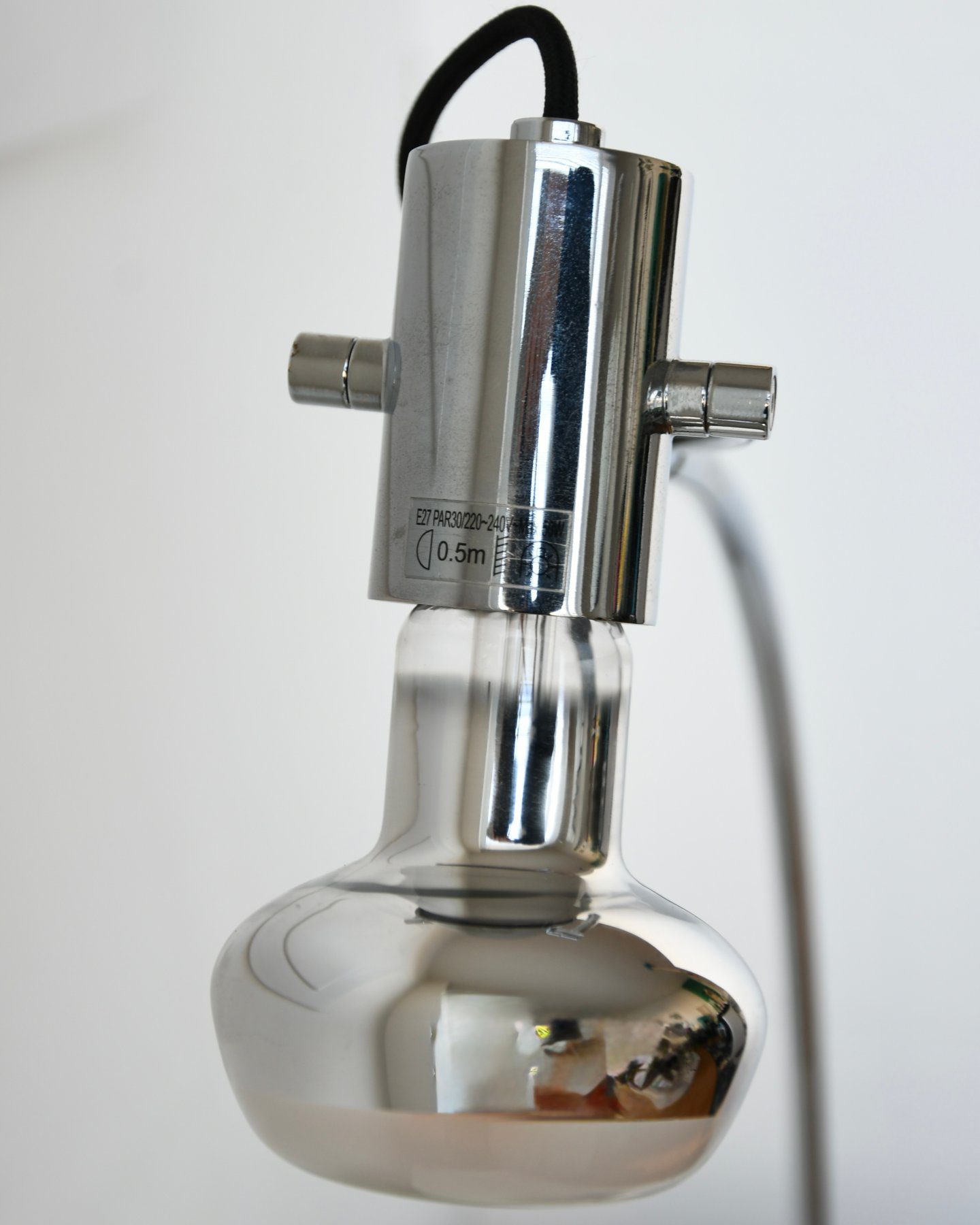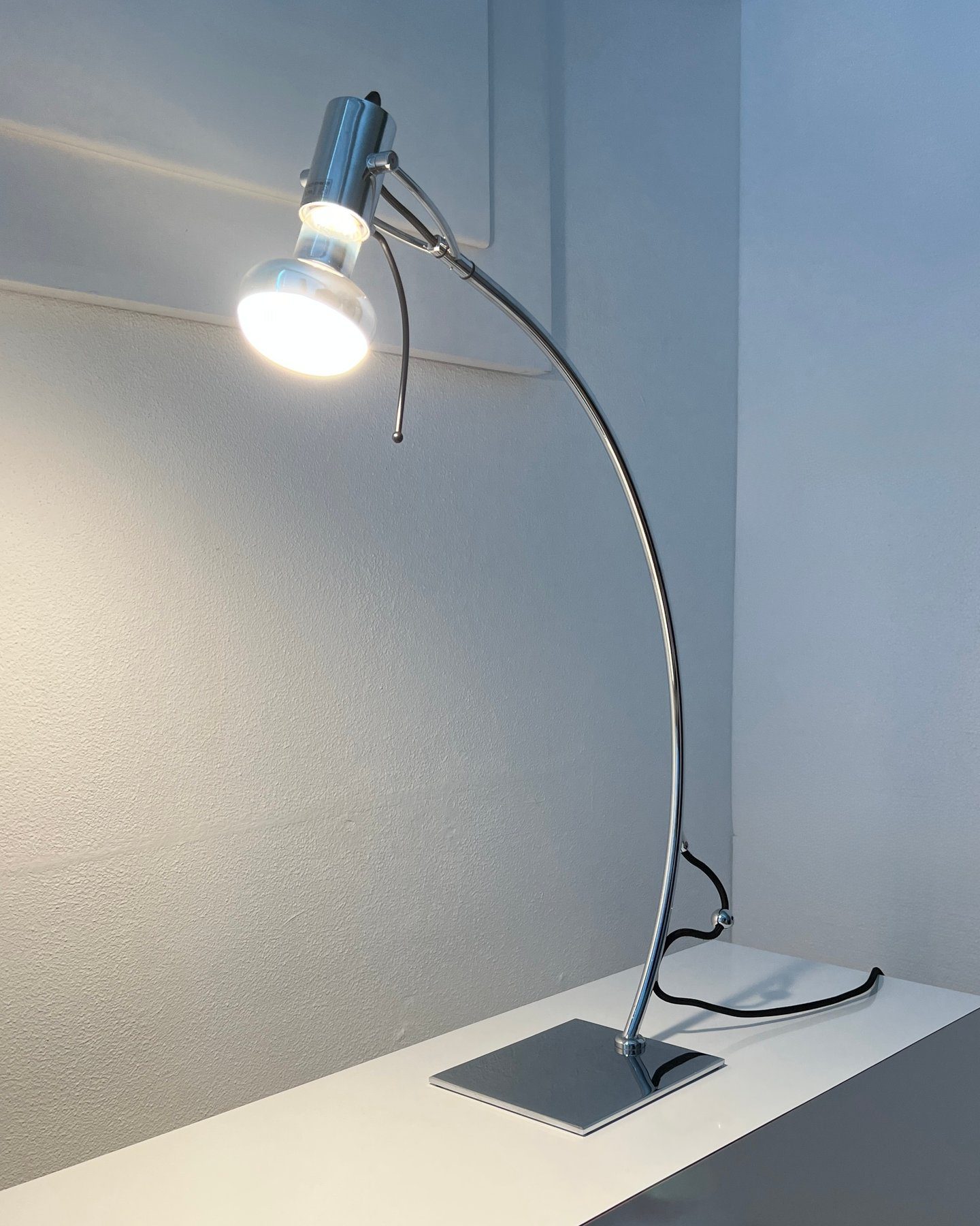 Elegante Franse designlamp van het label Igor Paris, vervaardigd in een beperkte oplage rond 2007. Het slanke, gebogen silhouet in chroomgeplateerd metaal creëert een sculpturale lijn die licht en ruimte met elkaar verbindt.