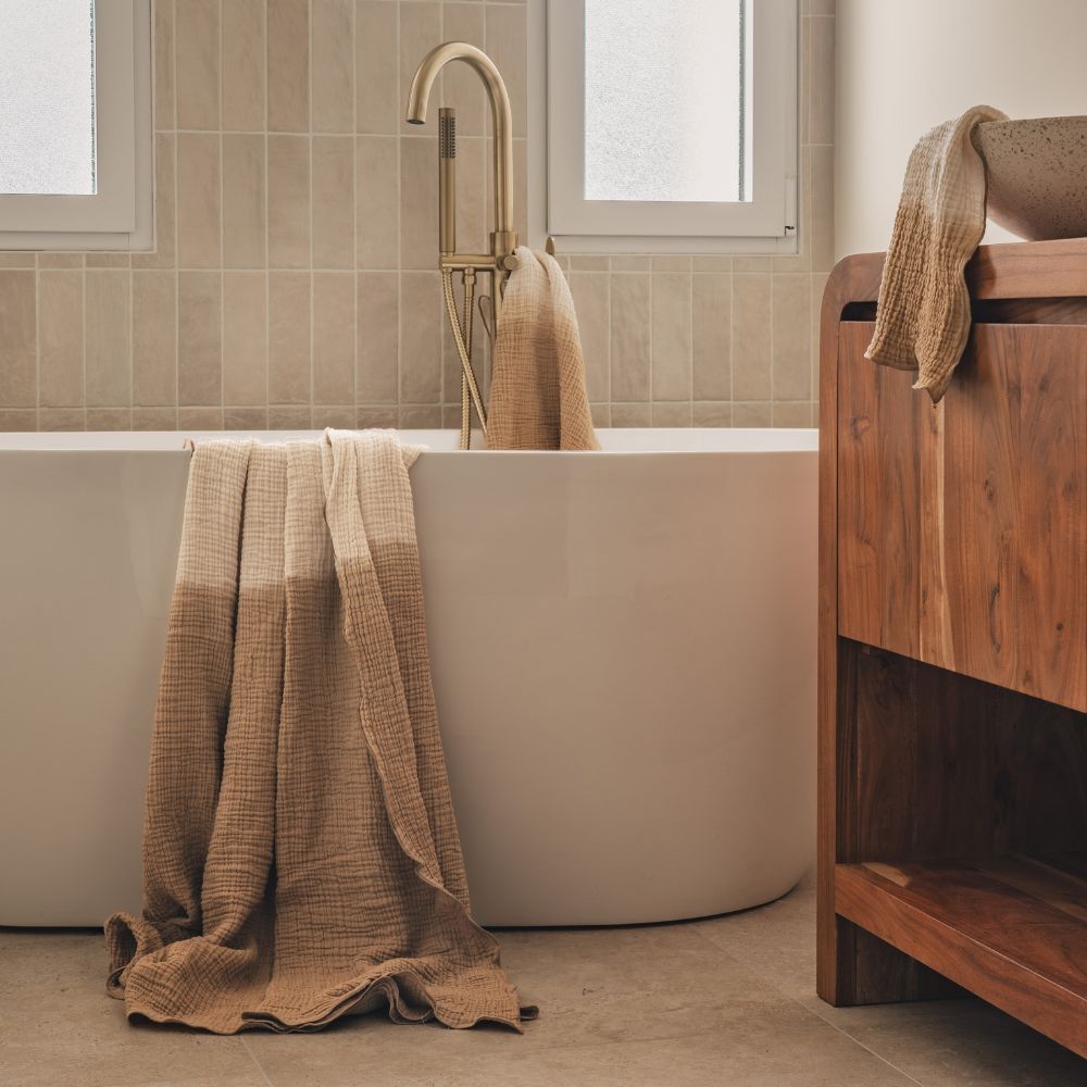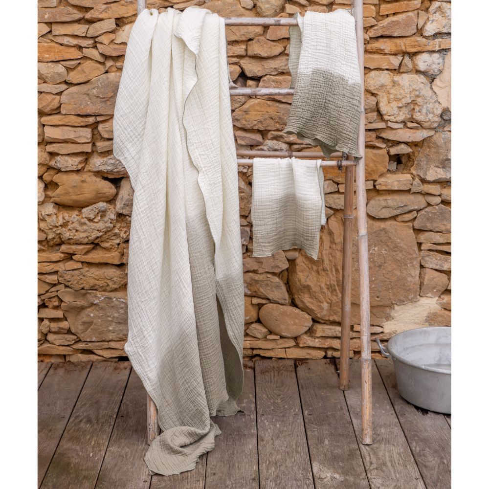 Met onze PHILO1 katoenen gaashanddoek, die tederheid en lichtheid combineert, is cocooning gegarandeerd. Het subtiele reliëf van het materiaal en de mini-hommelafwerking voegen een vleugje elegantie toe.